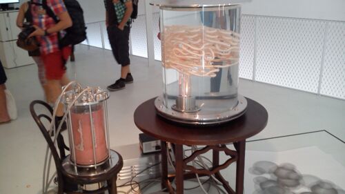 Zitat aus dem offiziellen Text: "Die CyberArts präsentiert den modellhaften Aufbau von PANCREAS, einer prozessualen Skulptur, die mithilfe von Biotechnologien Sprache und Literatur in Materie und Fleisch übersetzt. Die Seiten eines Buches (Hegels Phänomenologie des Geistes) werden geschreddert, in Wasser eingeweicht und in einen künstlichen Darm (Biofermeter) gepresst, wo Bakterien die Zellulose zu Glukose zerlegen. Nach ihrer Filterung und Reinigung ernährt die Glukose menschliche Gehirnzellen, die in einem Glasbehälter heranwachsen."