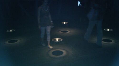 Was für die Recording-Nerds unter uns. Auf vier leuchtenden Säulen ist jeweils eine Bandmaschine (irgendwelche Revox, den genauen Typ hab ich mir nicht gemerkt) montiert, allerdings nur mit einer Spule. Das Band läuft von dieser Spule am Tonkopf vorbei und unten lose in die Säulen. In Zyklen von einigen Minuten werden die Aufnahmen abgespielt, wenn sie komplett durchgelaufen sind spulen die Maschinen automatisch zurück, begleitet von dem bekannten Rewind-Geräusch.
