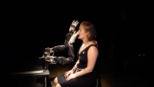 Wieder mal das Thema "Interaktion zwischen Mensch und Maschine". In einem kleinen abgedunkelten Raum steht ein Stuhl, davor liegen regungslos zwei Roboterarme. Wenn man sich auf den Stuhl setzt, beginnt die Maschine, den Oberkörper und Kopf ihres Gegenübers ganz vorsichtig mit den Händen abzutasten. Erinnert in ihren Bewegungen dabei stark an Blinde, die ihre Umgebung versuchen durch die Fingerspitzen zu erfahren. Wer die natürliche Skepsis vor der Situation überwindet, erfährt am eigenen Körper, wie sensibel auch künstliche Hände sein können. Verblüffend.