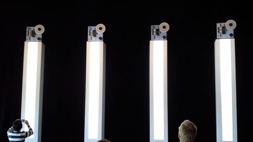 Was für die Recording-Nerds unter uns. Auf vier leuchtenden Säulen ist jeweils eine Bandmaschine (irgendwelche Revox, den genauen Typ hab ich mir nicht gemerkt) montiert, allerdings nur mit einer Spule. Das Band läuft von dieser Spule am Tonkopf vorbei und unten lose in die Säulen. In Zyklen von einigen Minuten werden die Aufnahmen abgespielt, wenn sie komplett durchgelaufen sind spulen die Maschinen automatisch zurück, begleitet von dem bekannten Rewind-Geräusch.